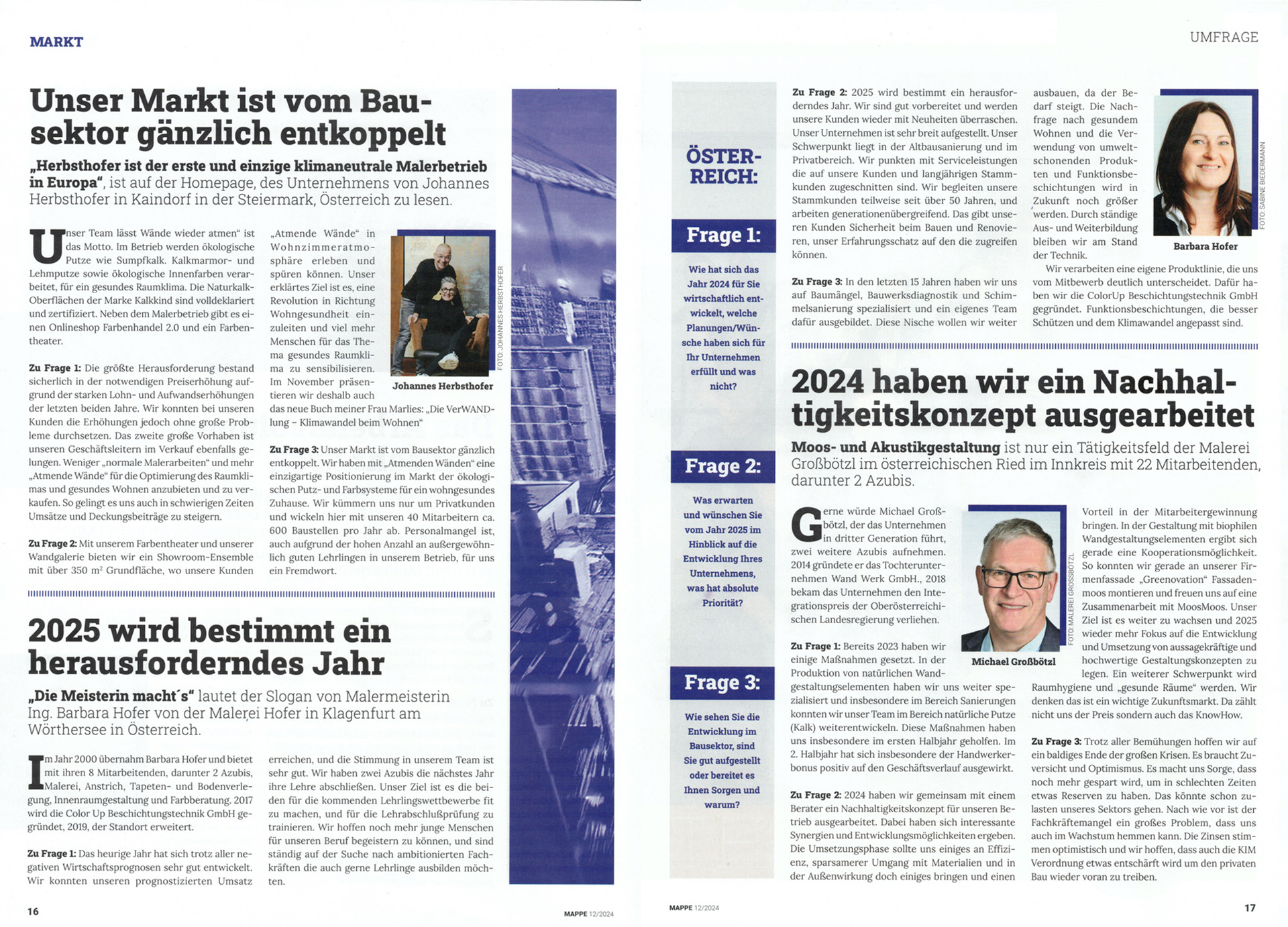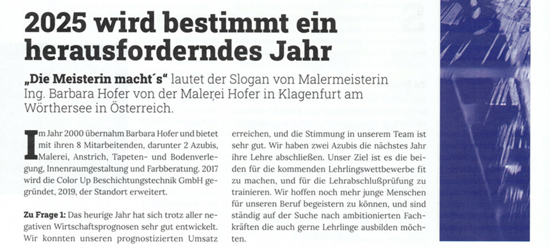 Malerei Hofer kennt keine Grenzen. "Mappe", das deutsche Fachmagazin für Maler:innen und Lackierer:innen, holte sich bei Malermeisterin Barbara Hofer einen Branchenausblick fürs Jahr 2025. mehr lesen